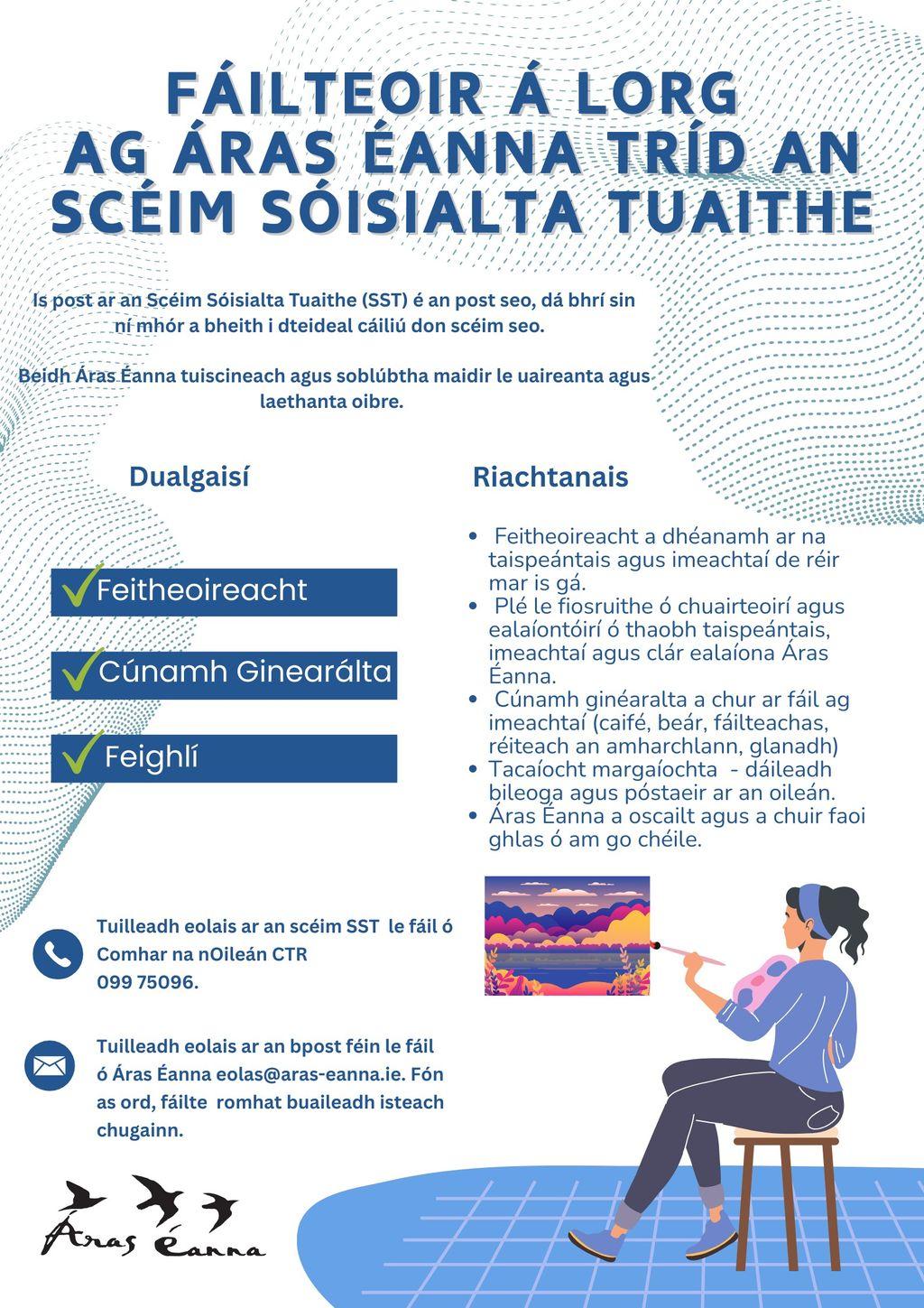 Áras Éanna seeks front of house person through Rural Social Scheme Áras Éanna is willing to be flexible inregards to working days and hours. You must be eligible for the RSS scheme to avail of this post. • Invigilate exhibitions & events as needed • Deal with enquiries from visitors and artists • General help before and at events (café, bar, theatre set-up and cleaning) • Assist with promotion – deliver flyers and posters • Open and close Áras Éanna from time to time More information on RSS scheme from Comhar na nOileán CTR 099 75096 More information on the role from Áras Éanna eolas@aras-eanna.ie Phones are out of order unfortunately, feel free to drop into the Arts Centre.