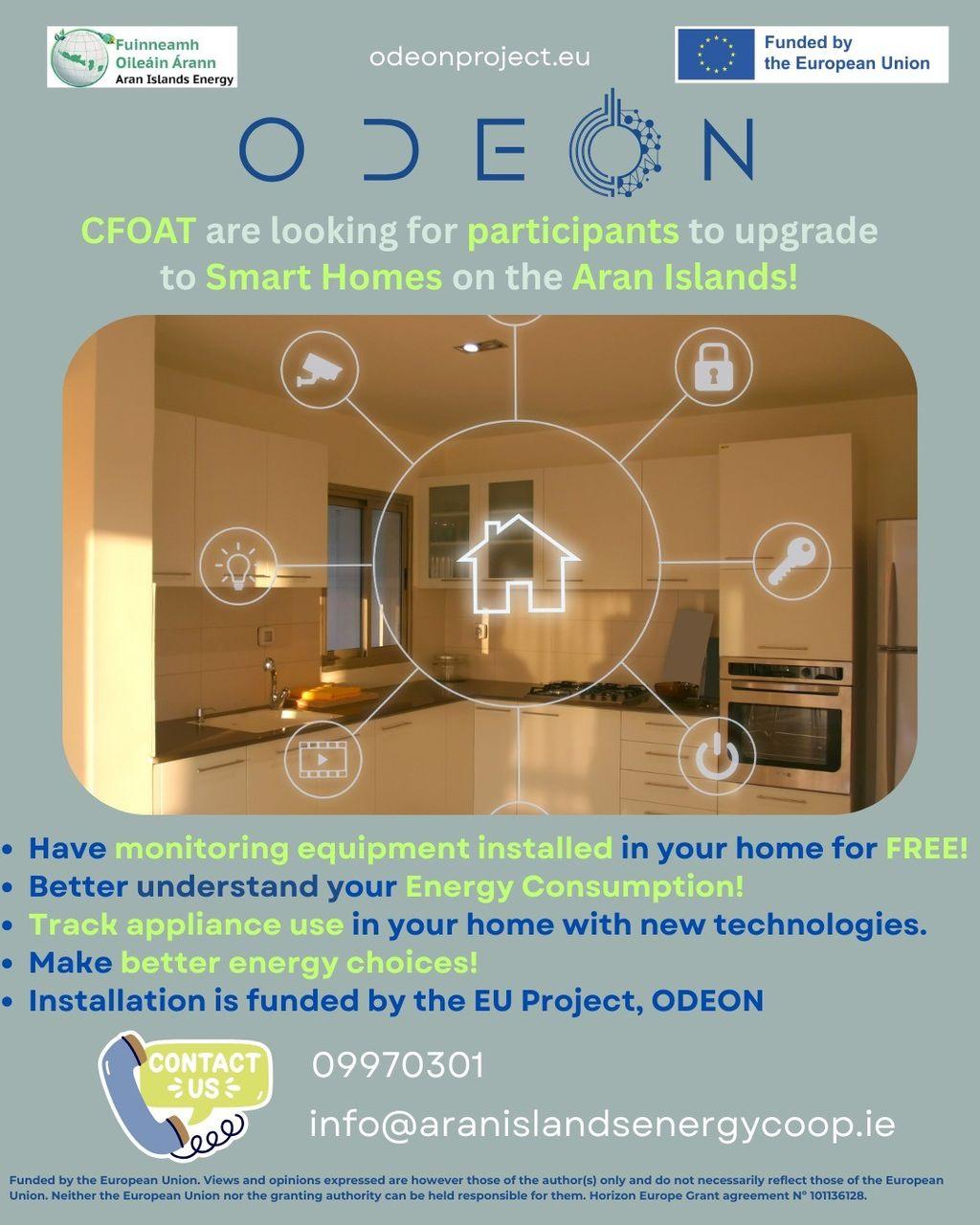 As part of the European Union project ODEON, CFOAT are currently recruiting homeowners on the three Aran Islands to take part. We are particularly interested in homeowners with Solar PV, Electric Vehicles, Heat Pumps and / or those with any other kind of renewable energy sources who are producing energy at home. Get in touch, info@aranislandsenergycoop.ie or 09970301